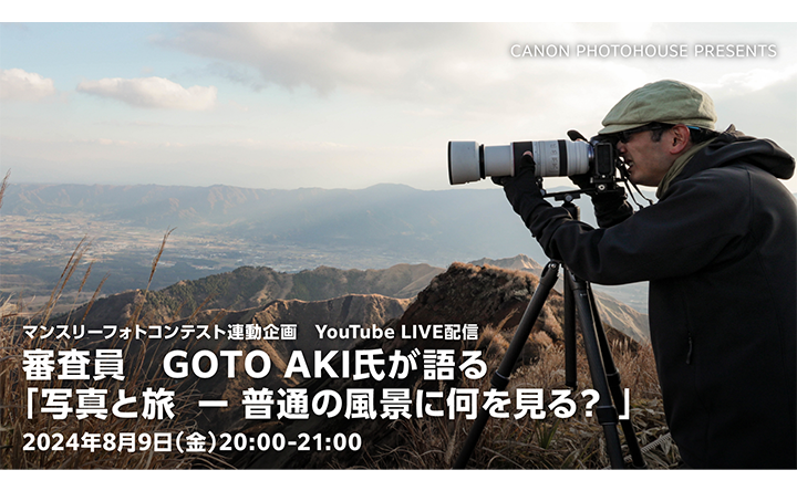 GOTO AKI氏が語る「写真と旅 ー 普通の風景に何を見る? 」マンスリーフォトコンテスト自然部門の審査員 GOTO AKI氏によるライブ配信のアーカイブ動画です。EOS R5 Mark IIのインプレッションと作品もご紹介しています。