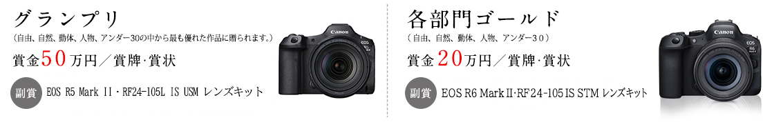 | ゴールド | 各1名 | 賞金20万円/賞状・賞牌 副賞EOS R6 MarkII・RF24-105 IS STM レンズキット |