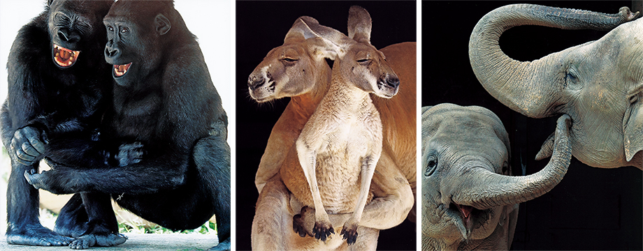 津留崎自然部門のゴールド賞は「仲良し」というタイトルですが、2匹がスキンシップをとっている瞬間をとらえ、仲良くしている雰囲気がよく伝わってきますね。あと、象の鼻の形とか、カンガルーが抱いている姿勢、チンパンジーが口を開けている表情など造形的にも面白く、それも作品の魅力です。