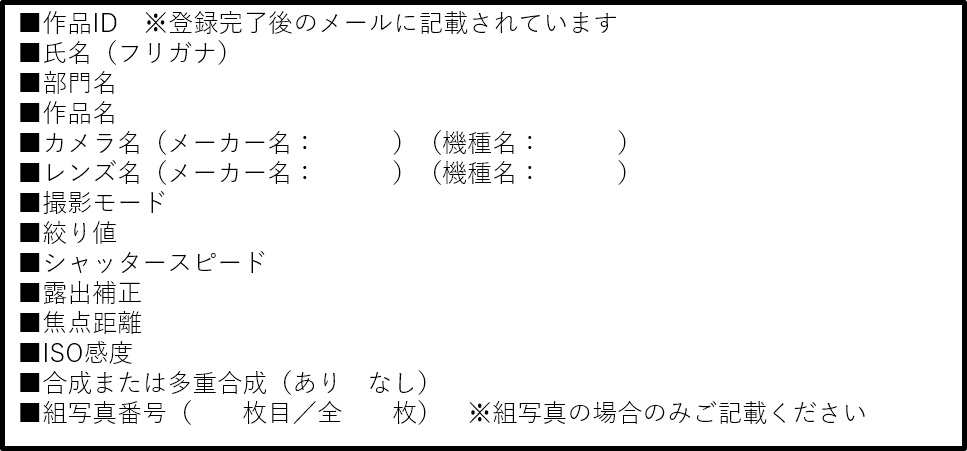 過去に受賞した作品、または同時期に他のフォトコンに応募中の作品の類似作品は応募できません。