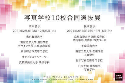 本展は、写真を学ぶ専門学校や大学計10校に在籍する学生の合同写真展です。展示会期を前期・後期に分け、5校ずつそれぞれの学校より選抜された学生の作品を展示します。
