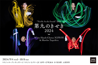 本展では、光るライトを入れた手袋を着用したホワイトハンドコーラスNIPPONのメンバーが、手歌でベートーヴェンの交響曲第九番の「An Die Freude(歓喜の歌)」を表現し、写真家の田頭真理子氏がその光の軌跡を撮影した作品を展示します。「音楽は聞こえないと楽しめない」という概念を壊す写真展となっています。