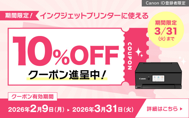 【キヤノンオンラインショップ限定】インクジェットプリンターに使える10%OFFクーポン進呈!Canon ID登録者限定で、インクジェットプリンターに使える10%OFFクーポンを進呈中です。