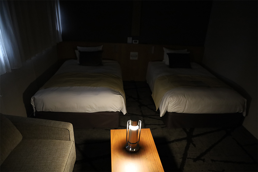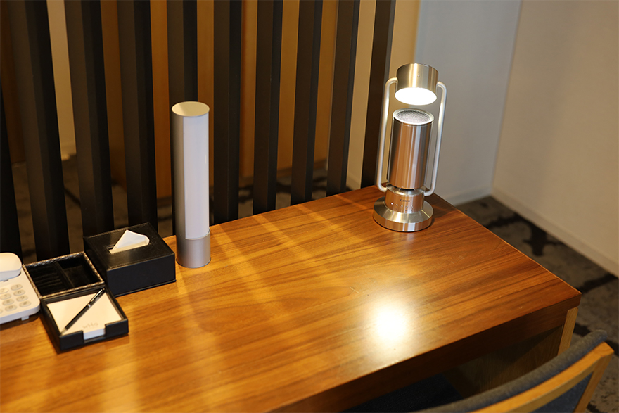 日中の観光からほっと一息つくための最適な備品として、コンフォートツインルームにてalbos Light & Speakerをご使用いただいております。土地柄、海外からの長期滞在者も多く、日々のリラックスの仕方にも変化があると良いとのこと。