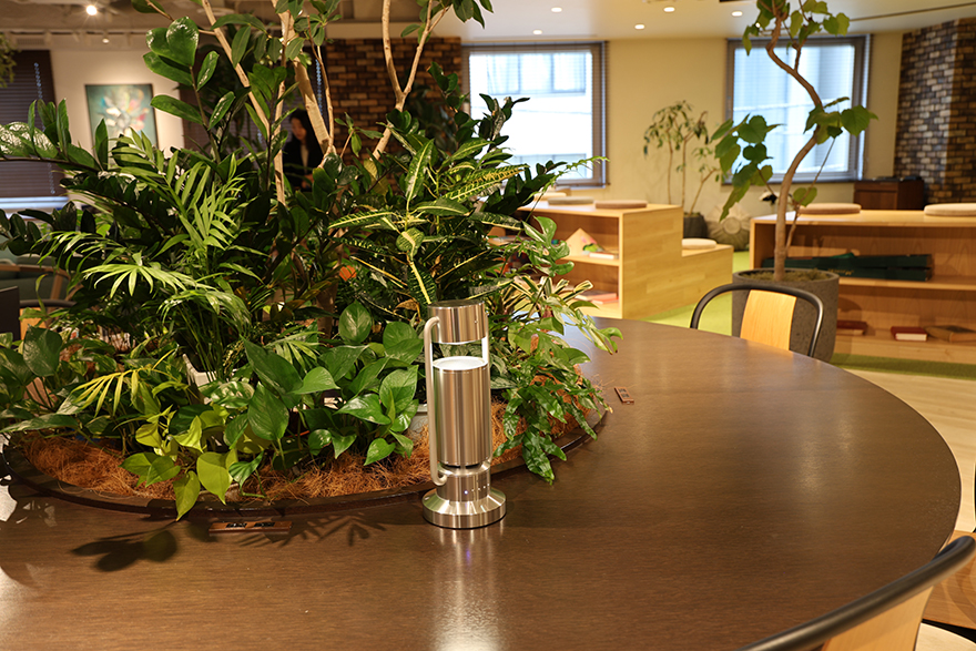 アース製薬様はより働きやすい環境を整えるためCafeやシミュレーションゴルフスタジオのリフレッシュスペースを拡充しており、albos Light & Speakerはそれぞれのスペースでインテリアとしてご利用いただいております。