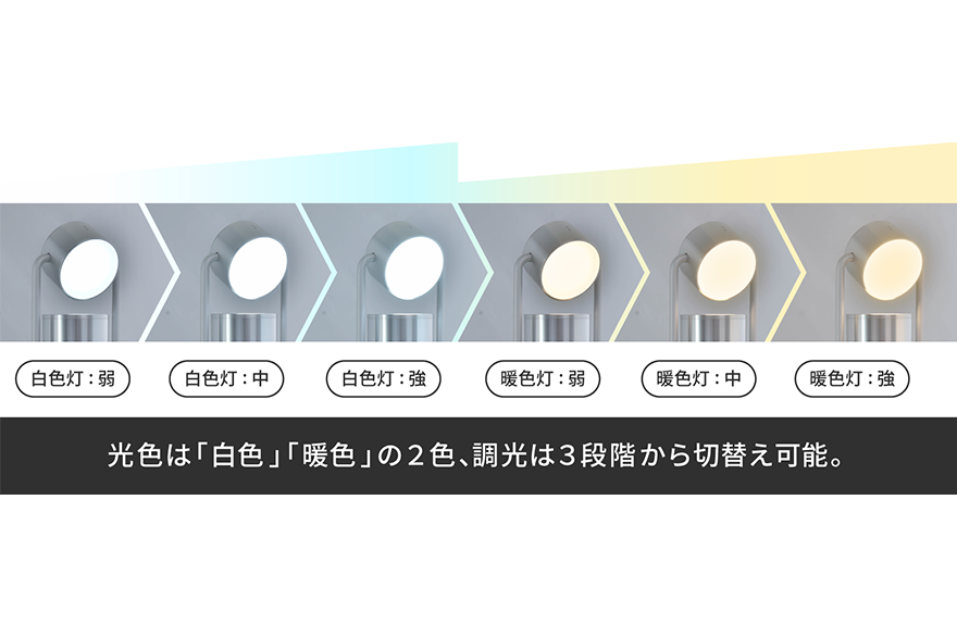 空間の雰囲気を大きく左右する光色は「白色」「暖色」の2色から、調光(光の明るさ)は「弱・中・強」の3段階から切替えが可能。