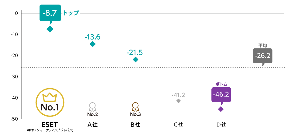 5事業者の平均が-32.0ポイントの中、ESETは-16.5ポイントをマークしました。
