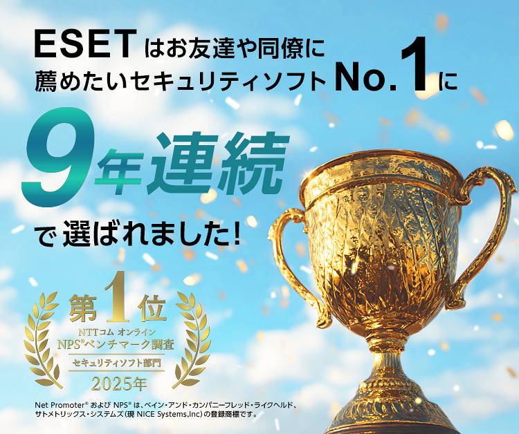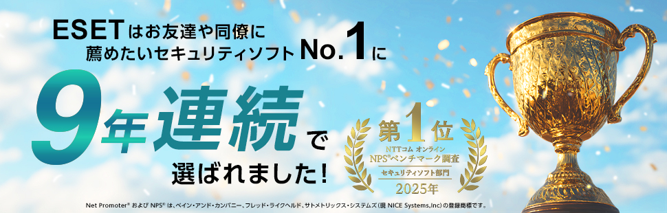 NTT コム オンライン NPS®ベンチマーク調査2025「セキュリティソフト」部門において、ESET(キヤノンマーケティングジャパン)が事業者5社のうち9年連続第1位を獲得しました。