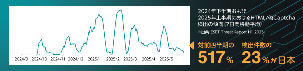 ESET社の「Threat Report H1 2025」によると、クリックフィックス詐欺は2024年下半期と比べて2025年上半期に517%増加。日本は世界で最も検出件数が多い国で、全体の23%を占めています(※出典:ESET Threat Report H1 2025)。これは、日本国内のユーザーが標的になりやすいことを示しており、特に偽のセキュリティ警告や広告を通じた誘導が多く確認されています。企業だけでなく、個人ユーザーも被害に遭っており、情報漏えいや金銭的損失につながるケースが増加しています。