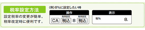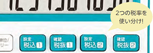 消費税率などを登録しておくことで、税込/税抜の計算がワンタッチで出来ます。 税率登録が2つ出来るモデルなら、税率改訂時や軽減税率計算の場合にも設定変更が不要なので大変便利です。