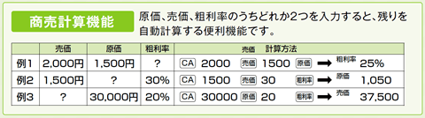 商売計算機能搭載モデルには、「売価」「原価」「粗利率」キーがあります。売価、原価、粗利率の内いずれかが不明な場合、残り2つの数値、キーを入力すると、不明な数値が割り出せます。