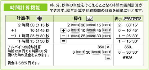 時、分、秒の時間の単位を通常の数値に換算せずに四則計算ができます。給与計算や勤務時間の計算に便利です。