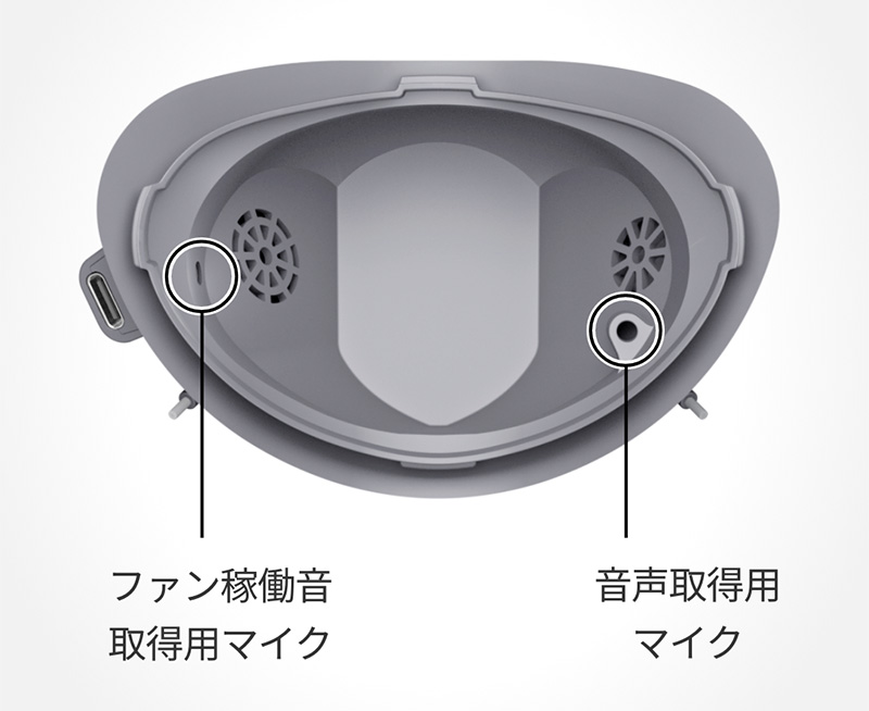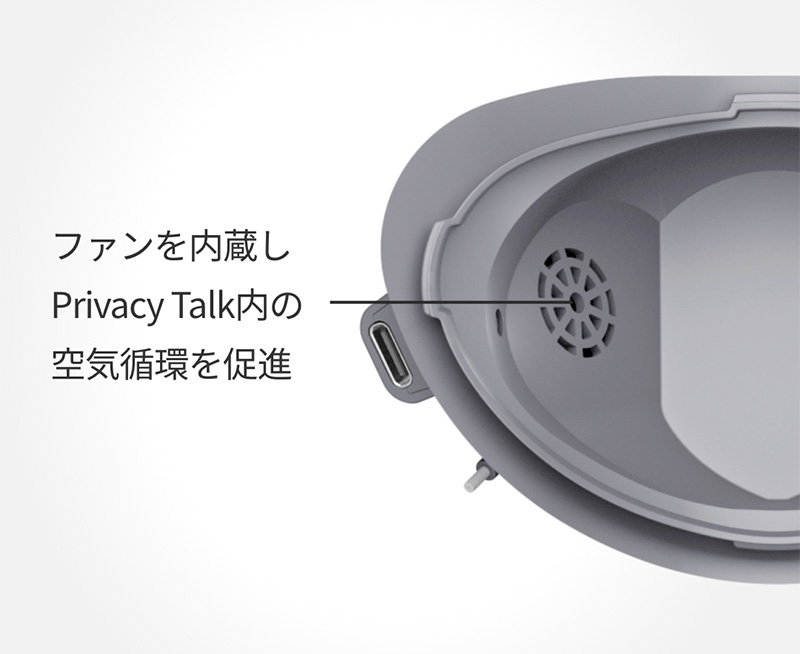 ファンを内蔵しPrivacy Talk内の空気循環を促進することで、より快適な着け心地を叶えました。ファンOFF時と比較して、ファンON時の方が話しやすく、また呼気内の水分による湿気がたまりにくくなります。