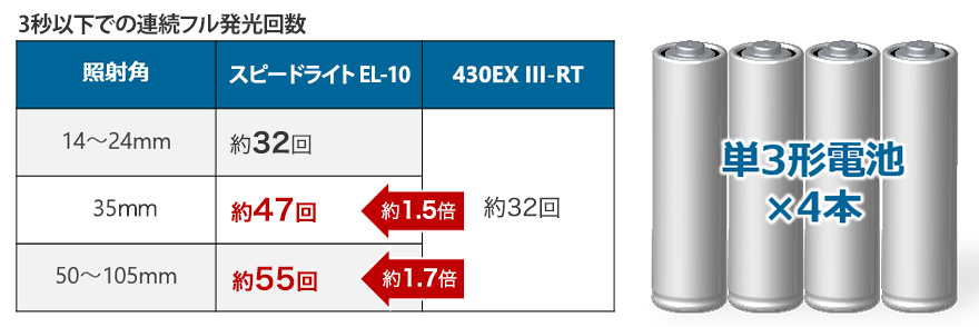 放熱板の拡大による基板の放熱性の向上や、ズーム位置に応じた連続発光回数の最適化、充電完了までの所要時間に応じた発光制限の採用などにより、スピードライト 430EX III-RT と比較して連続フル発光可能回数を向上。連続して撮りたいシーンをテンポよく快適に撮影することができます。また、バッテリーは汎用性が高い単3形電池を採用。専用バッテリーとしないことで、入手がしやすく、電池切れ時も安心です。