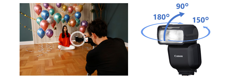 発光部が上90°、左150°、右180°に幅広くバウンス可能で、カメラと反射面の位置関係にしばられることなく、必要な方向に発光できます。