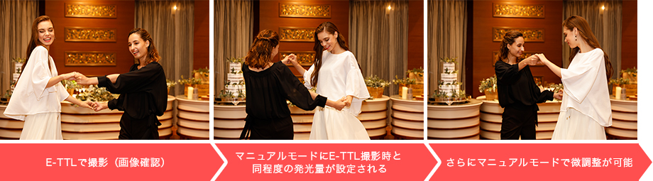 FEメモリーは、E-TTL撮影後にマニュアルモードに切り換えて撮影するとE-TTLで記憶した発光量のまま撮影を継続できる機能です。マニュアルモードでさらに微調整が可能です。