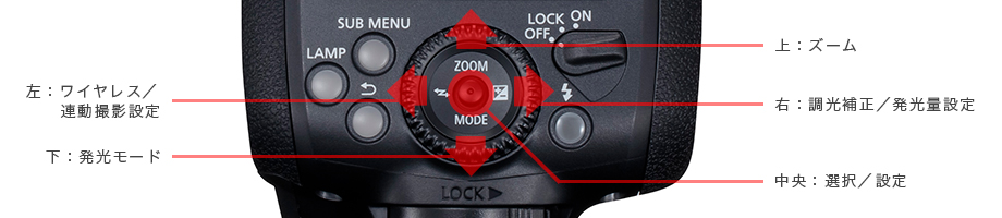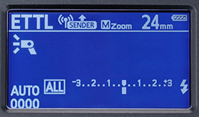 表示パネルには暗い環境でも小さなアイコンや文字が見やすい反射型メモリー液晶を採用。調光補正量や発光量以外にもバッテリー残量表示にも対応しています。