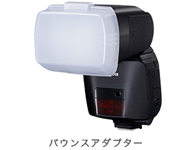 バウンス撮影時、ストロボ光を拡散して和らげるバウンスアダプターを同梱。バウンス発光時にできる影を抑制し、より自然な雰囲気の撮影が可能に。また、バウンスアダプター使用時には、よりなめらかな配光特性が得られるため、フェザリングを使用した撮影にも有効です。プロのニーズに応えた脱落しにくい形状も安心です。