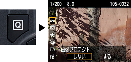 再生中にクイック設定ボタンを押すと、クイック設定状態に。録画再生時は画面の左側に「画像プロテクト」「画像回転」「レーティング」「クリエイティブフィルター」「リサイズ」「電子ダイヤルでの画像送り」が表示され、それぞれの設定を行うことが可能。動画再生時は「画像プロテクト」「レーティング」「電子ダイヤルでの画像送り」のみ設定できます。