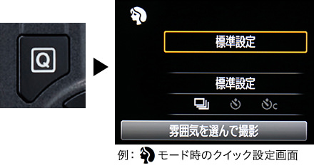 ボディー背面の専用ボタンを押すと表示される、クイック設定画面。シャッター速度や絞り数値、ISO感度、露出、記録画質など、主要機能を集約。十字キーとSETボタンの操作で、スムーズな設定変更が可能です。