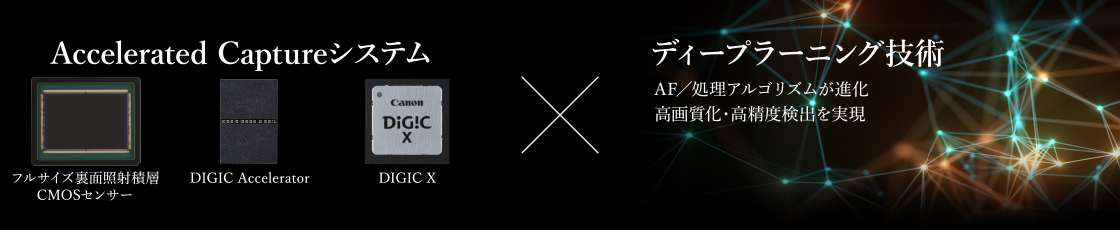 画質、ドライブ性能、AF、動画性能、すべて過去の「1」を超越する。その使命を果たすべく搭載されたのが、新たなるエンジンシステムAccelerated Capture。新開発の裏面照射積層CMOSセンサー、映像エンジンDIGIC Xに加え、解析処理を瞬時に行うもう一つの“DIGIC” DIGIC Acceleratorを搭載。これら3つが高度に連携し、EOS史上もっともパワフルなエンジンシステムへと進化を遂げました。この大量データを高速処理するシステムに、ディープラーニング技術をベースとした解析技術を融合。EOSの新たなるフラッグシップにふさわしい性能を実現しています。