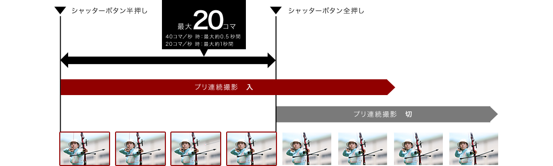 シャッターボタンを押したタイミングよりも、最大20コマ分さかのぼって静止画を記録することができる撮影機能。撮影開始のタイミングが予測しづらい被写体も捉えやすく、勘や経験に頼らない安定した撮影が可能です。RAW/C-RAW/JPEG/HEIFいずれの記録モードでも使用でき、RAWバーストモードのように撮影後の切り出し作業が不要。また、ライブビュー表示も高速化され、使い勝手が大きく向上しています。