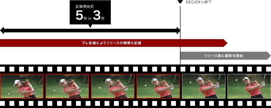 動画撮影を開始した際、撮影開始3秒/5秒前から動画を記録することができます※。不意に訪れるシーンの記録や、シーンの変化を待つ間の記録を停止しておくという撮影方法も可能。不要な映像が減り、ファイルサイズの節約や編集作業の負担軽減などに貢献します。