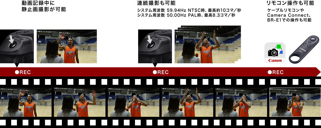 [動画撮影中静止画記録:入]設定時、動画はXF-AVC S YCC420 8bit、フルHD、59.94/50.00/29.97/25.00 fps、Long GOPで記録、静止画は5616×3168、アスペクト比(約)16:9、JPEGで記録されます。カード1に動画、カード2に静止画が記録されます。