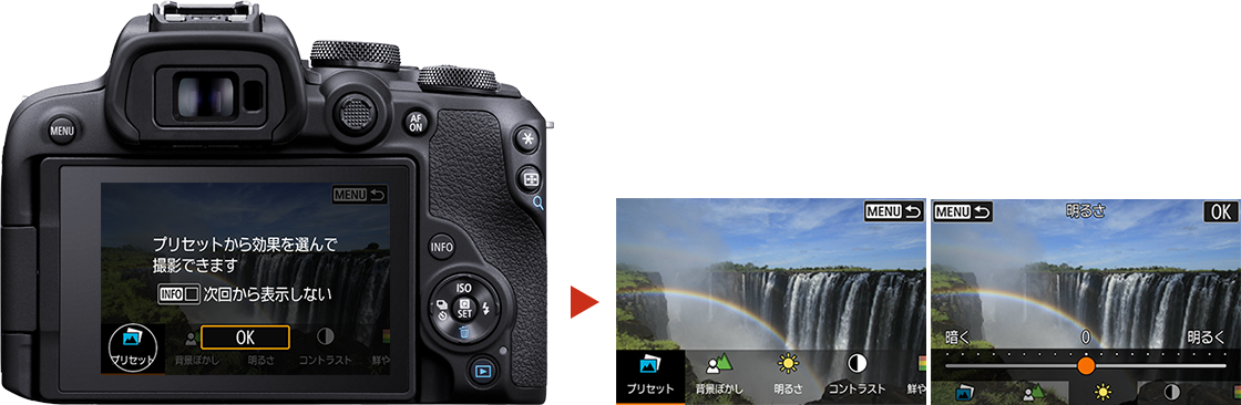 全自動の[シーンインテリジェントオート]モード撮影時、背景のボケ具合や明るさ、コントラストなどをかんたんに変えることができる機能です。専門用語を知らなくても、こんな写真に仕上げたいという思いに応えます。液晶モニターで、仕上がりイメージの画像を確認しながら操作・撮影できます。