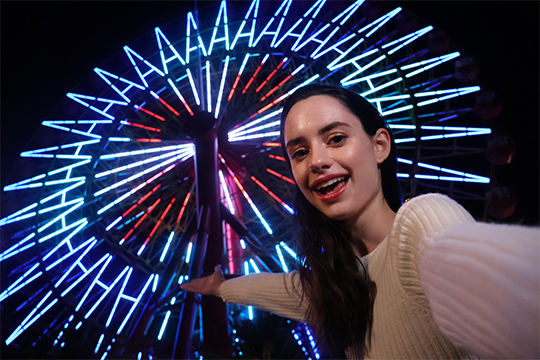 夜景を背にした人物撮影に便利。夜の街並みやイルミネーションなどの夜景を写しつつ、手前の人物もキレイに写せます。
