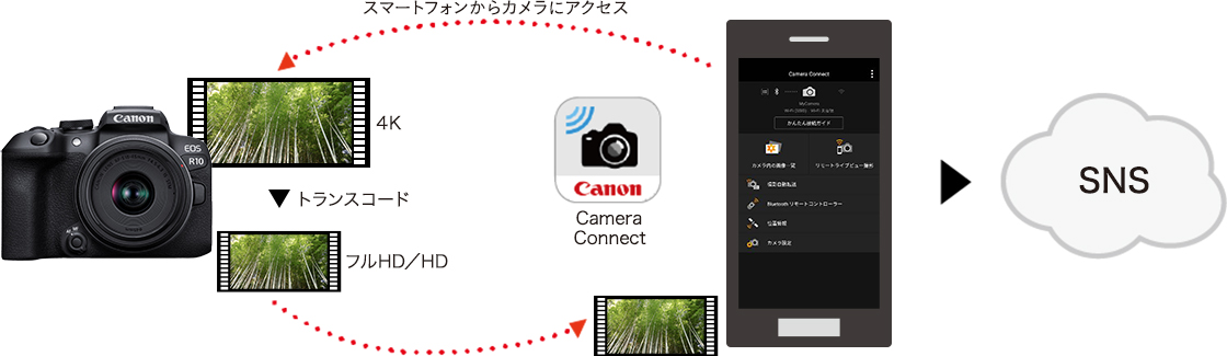 動画をカメラ内で圧縮し、スマホやSNSへの転送をスムーズにします。たとえば4K動画をフルハイビジョン動画(25P)に。60Pのフルハイビジョン動画を30Pに圧縮可能。専用アプリ「Camera Connect※」を使えば、動画を圧縮しながらスマホやタブレットに転送することもできます。