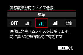 [マルチショットノイズ低減]は、1回のシャッターで4枚の画像を撮影し自動合成。解像度を保ったままノイズを抑制できます。RAW/C-RAW設定時は、マルチショットノイズ低減は選択できません。