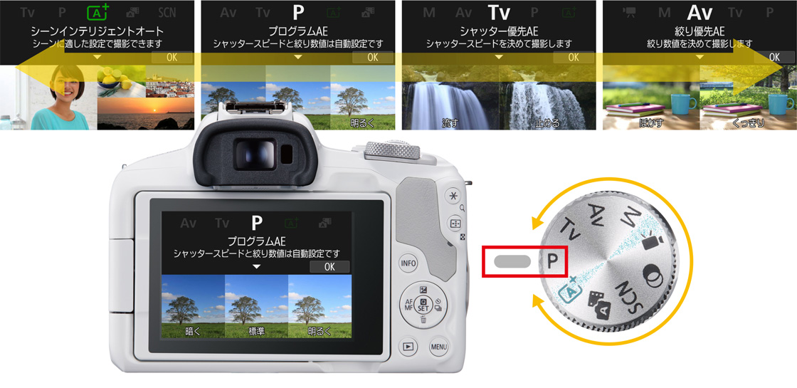 初心者でも多彩な機能や撮影モード、エフェクト効果を使いこなせるように。ビジュアルガイドを利用すると、それぞれの機能の効果がわかるようにグラフィカルな図と説明文を表示します。