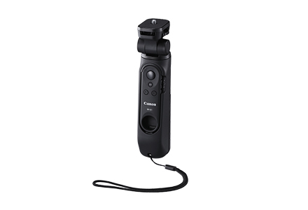 ワイヤレスリモートコントローラー BR-E1同梱の動画用グリップ。画角を調整しながらの自分撮りや、縦位置での動画撮影が可能です。また、グリップ部を開き小型三脚としての使用も。