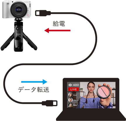 UVC/UAC に対応し、USBケーブルをつなげるだけでビデオ通話やライブ配信が可能。パソコン※1からのUSB給電※2に対応し、電池切れを心配をすることなく長時間配信に対応します。