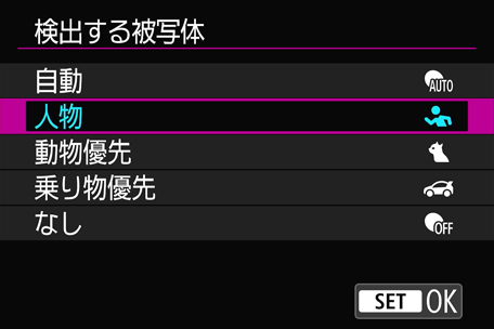 被写体検出アルゴリズムにより、画面内に入ったものが被写体かどうかを判断する性能が進化。「人物」は瞳検出での[右目優先][左目優先][自動]の設定が可能になったほか、「動物優先※1」は犬/猫/鳥に馬が追加され、「乗り物優先※2」では、モータースポーツに飛行機と鉄道が追加されました。より幅広い被写体に対し、高度かつ安定したトラッキングを行います。