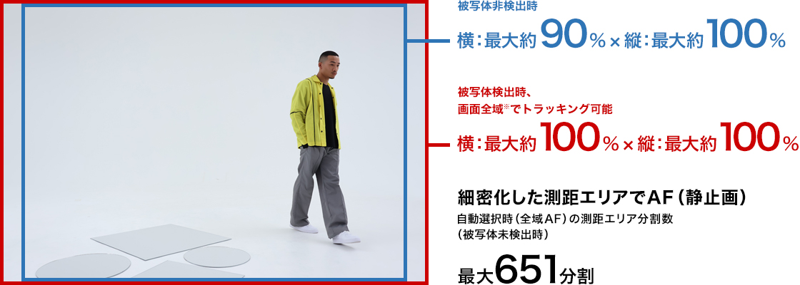 測距エリア 90 %(横 )× 100 %(縦)対応のレンズを装着し、全域 AF 時、および全域 AF 以外で被写体検出時のみ。シーンや被写体の状態によっては、 AF フレームが測距エリアの隅まで移動できないことがあります。対応するレンズについては、「対応レンズ別AF測距エリア」をご参照ください。