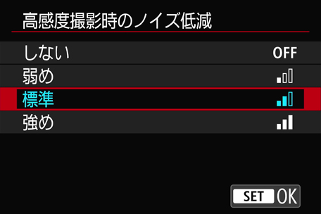 長秒時露光撮影時と高感度撮影時にノイズを低減する機能を搭載しています。長秒時露光撮影時は[しない/自動※/する]から選べ、露光時間が長い時に発生しやすいノイズを低減します。また、高感度撮影時は[しない/弱め/標準/強め]から選べ、ISO感度を上げた時に生じるノイズ・ざらつきを低減します。