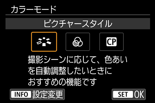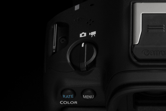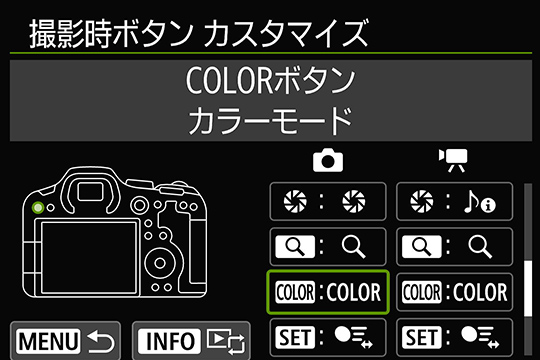 ボタンひとつでカラーモードの選択画面を表示できる[COLOR/RATEボタン]を新たに搭載。動画モード時は、従来の[ピクチャースタイル]に加え、新たに搭載された[カラーフィルター][カスタムピクチャー]の3つのカラーモードをすばやく切り換えることができます。ボタンカスタマイズで任意の機能を割り当てることも可能。