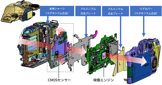 センサーからグラファイトシートやアルミニウム合金プレートを介してマグネシウム合金製の外装及びシャーシへ放熱。長時間の動画撮影でも安心して使用できるよう設計しています。
