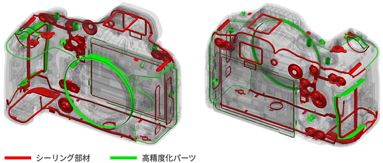電池室やカードスロットカバー開閉部などにシーリング部材(赤色部分)を使用。ダイヤル回転軸などは部品間の隙間を極力小さくする構造を採用。これにより、不用意に降りかかる砂塵や水滴などの侵入を抑制します。