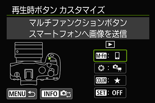 [マルチファンクションボタン]が[マルチファンクション/スマートフォンへ画像を送信ボタン]に改良。画像再生中にボタンを押すと、[スマートフォンへ画像を送信]の画面がダイレクトに表示されます。撮影したばかりのベストカットをすぐにスマートフォンに送れるため、SNSで共有したい場合などに便利です。