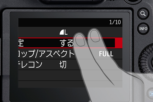 バリアングル液晶モニターには静電容量方式のタッチパネルを採用。さまざまな設定を直感的に操作できます。2本指でダブルタップすることでメニュー画面を拡大表示することが可能。[タッチ操作:しない]の設定にも対応しました。