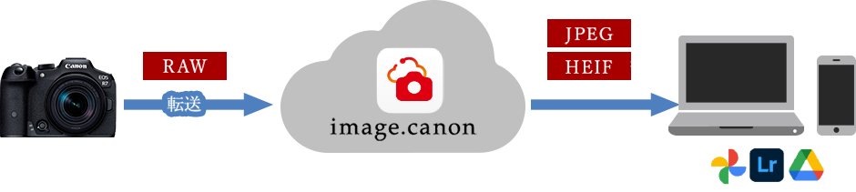 ディープラーニングにより開発した画像処理アルゴリズムにより、image.canonを使ってクラウド上で高画質なRAW現像が可能。カメラで撮影したRAW画像とカメラで設定した現像条件をimage.canonに送信し、高度な現像処理を行います。クラウドRAW現像では、ノイズやモアレ・偽色を低減する処理機能が大幅に進化。より自然でクリアな画像(JPEG/HEIF)に仕上げることができます。