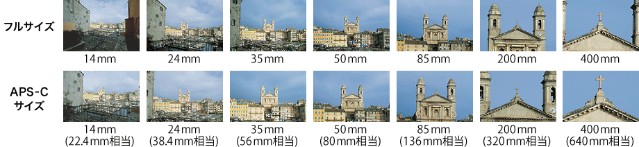 また、APS-Cデジタル一眼レフは、35mm判カメラより受光部が小さく、同じレンズを装着しても得られる画角が異なるため画角を換算する必要があります。EFレンズをAPS-Cデジタル一眼レフで使用する場合、約1.6倍望遠側に換算されることになります。