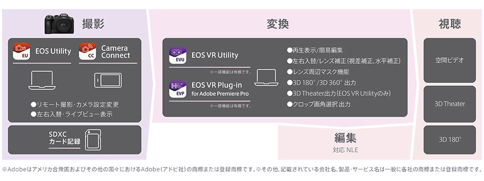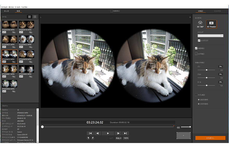 EOS VR SYSTEMを使用して撮影した静止画・動画を180°VR画像へ変換するためのアプリケーションです。レンズの構造上左右逆に記録されている魚眼画像の左右入替や、レンズの各種補正対応(視差補正、水平補正)、再生・簡易カット編集が行えます。その他に明るい状況での撮影時、イメージサークル外に光が漏れて視聴の妨げになるのをマスクしてカバーするレンズマスク機能を備えています。
