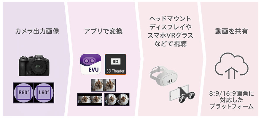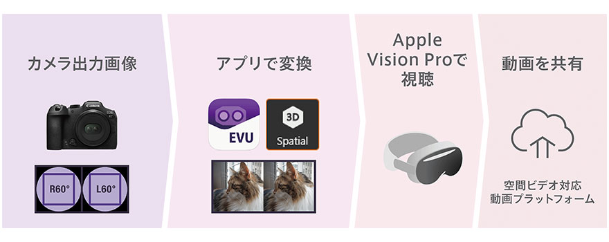 RF-S7.8mm F4 STM DUALと対応カメラで撮影した映像をアプリ「EOS VR Utility」※1で「空間ビデオ」の映像フォーマットに変換することにより、「Apple Vision Pro」で「空間ビデオ」の視聴が可能となります。