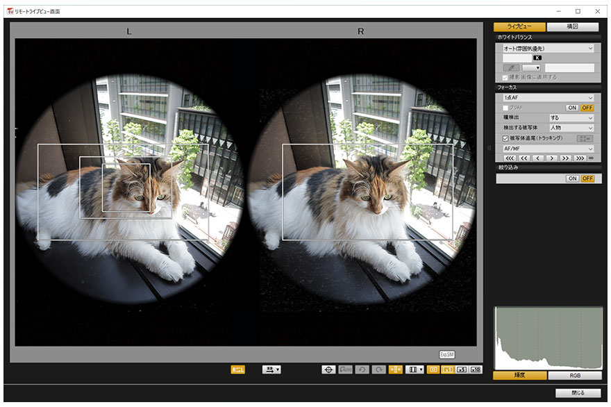 「EOS Utility」は有線・無線接続でPCからのリモート撮影に対応。ライブビュー撮影で[左/右]を切り替えて表示することが可能です。「Camera Connect」は、スマートフォンやタブレットとWi-Fi接続し、リモート撮影が可能。屋外での撮影に便利です。