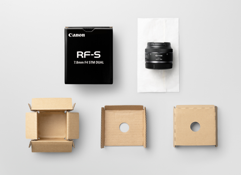 キヤノンは、従来の包装設計思想を維持しながら、包装材の脱プラスチック対応(コーティング素材は除く)を進めています。輸送時の衝撃や保護に対し、これまでのEFレンズ・RFレンズのLレンズ同等の品質への配慮を行なっています。