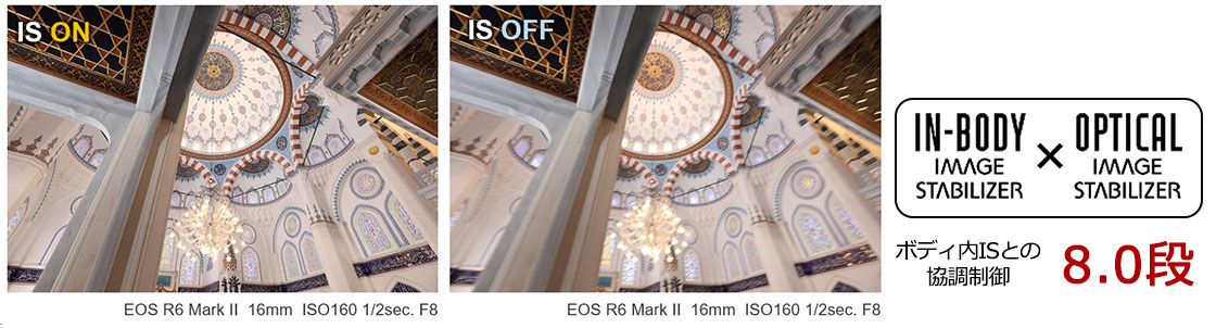 レンズ内光学式手ブレ補正機構(OIS)によりCIPA2024規格、中央5.5段(焦点距離28mm、EOS R8使用時、Yaw/Pitch 方向)の手ブレ補正効果。ボディー内手ブレ補正機構(IBIS)との協調制御によりCIPA2024規格、中央8.0段、周辺7.5段※(焦点距離28mm、EOS R1使用時、Yaw/Pitch/Roll 方向)の手ブレ補正効果。